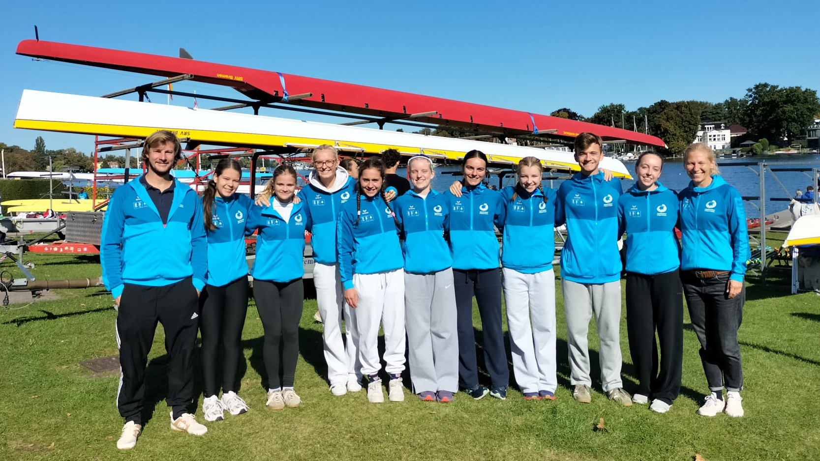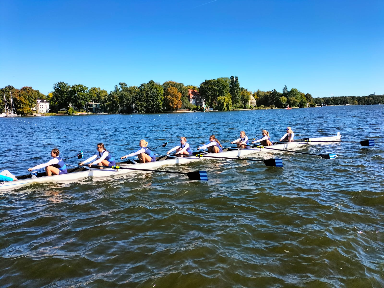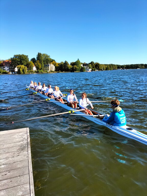 Vom 21.09 bis zum 25.09.25 war unsere Mädchenruderschulmannschaft mit Steuermann in Berlin um am Herbstfinale von Jugend trainiert für Olympia teilzunehmen, für das wir uns vor den Sommerferien qualifiziert hatten. Nachdem wir am Sonntag mit der Bahn angereist und am Hauptbahnhof schon viele Sportler bei der Akkreditierung kennengelernt hatten, fuhren wir zur Unterkunft und waren anschließend gemeinsam Pizza essen. Am Montag hatten wir am Vormittag noch einmal Zeit unsere Boote zu trainieren und während einige am Nachmittag in der Unterkunft ihr Kräfte schonten erkundete der Rest weite Teile der Stadt.